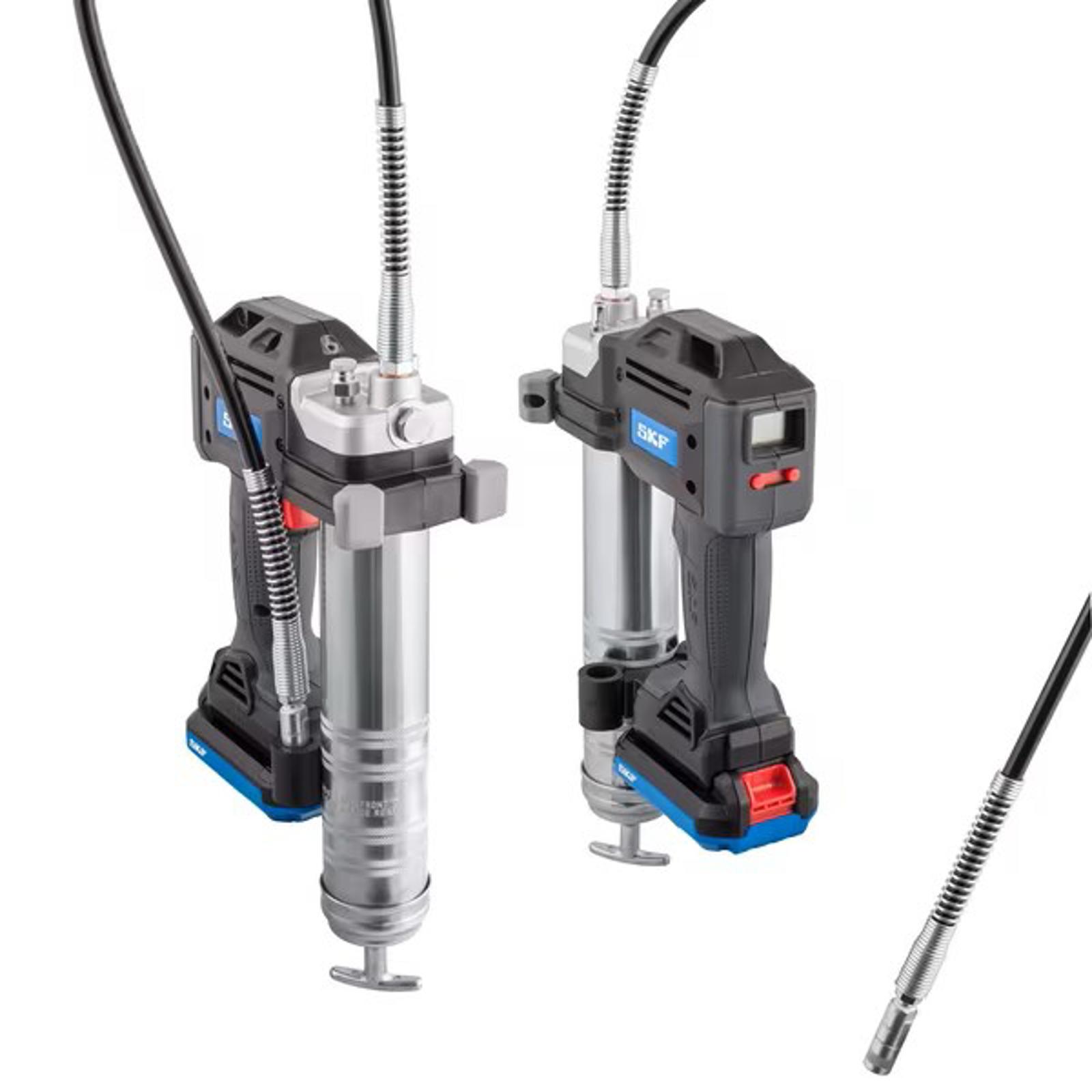 SKFs batteridrivna fettspruta TLGB 21 är utvecklad för maximal effektivitet och har en integrerad fettmätare som hjälper till att förhindra över- och undersmörjning. Detta unika verktyg har en hållbar, ergonomisk design med ett fyrpunktsstativ för komfort och bekvämlighet för användaren och ett 2,5 Ah litiumjonbatteri för långvarig användning. Verktygets display visar batteriets laddningsnivå, mängden fett som doseras, pump-/motorhastighet och blockerade smörjpunkter. Denna kraftfulla och mångsidiga fettspruta har två flödeshastigheter – låg och hög – och kan dosera upp till 24 fettpatroner per batteriladdning. TLGB 21 kan leverera tryck upp till 690 bar (10 000 psi) och har en inbyggd lampa för att belysa arbetsområdet. Integrerad fettmätare spårar utmatat fett