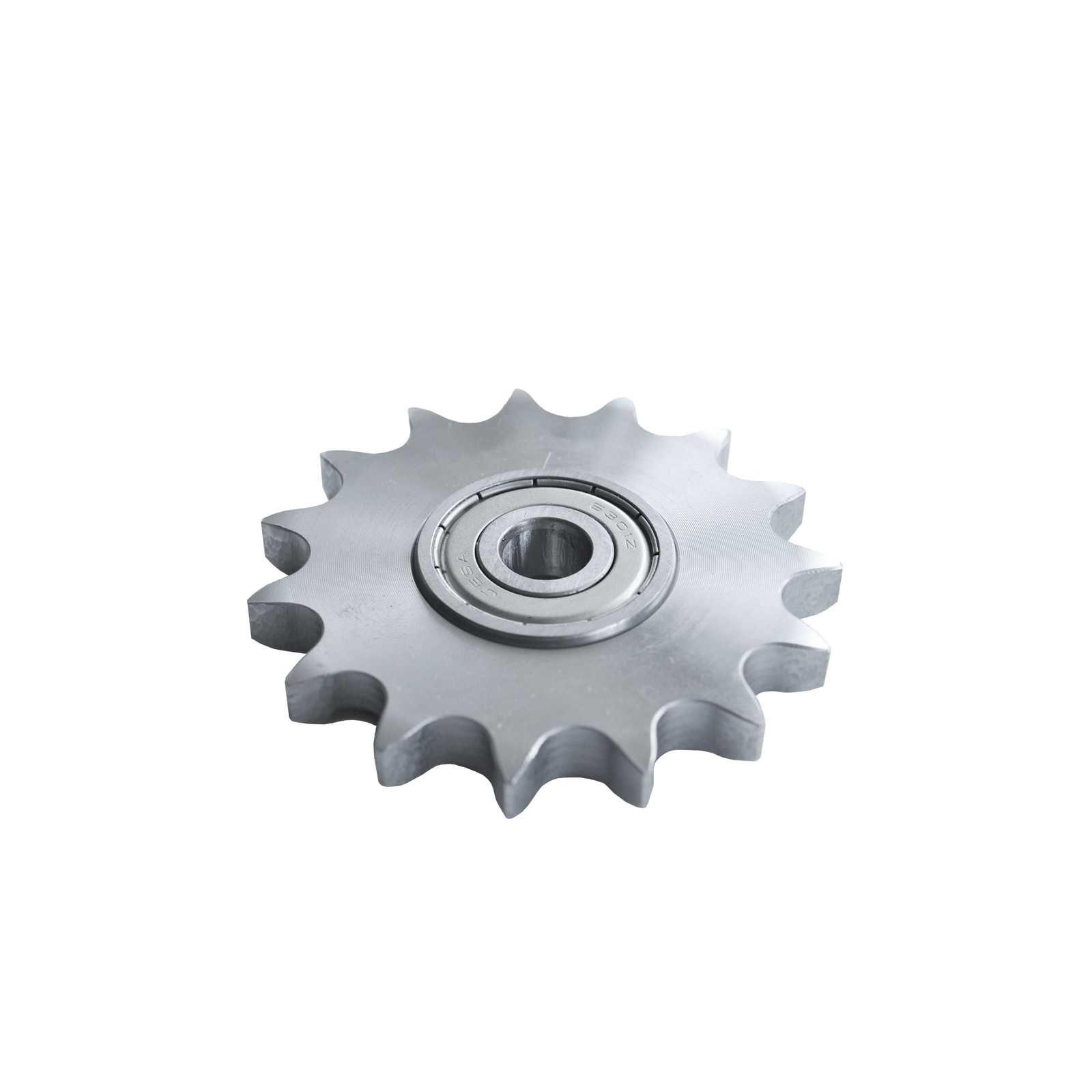 Kedjespännhjul för kedja. Finns i utförande med kullager för axelmontage samt med kullager för montage på spännarm.